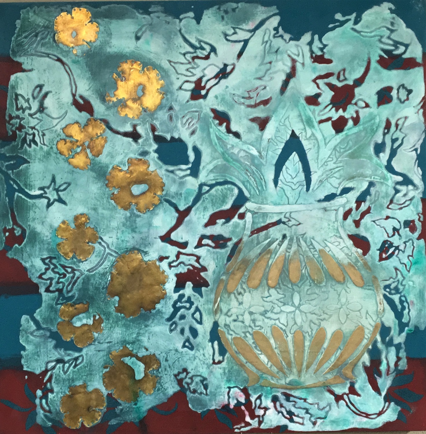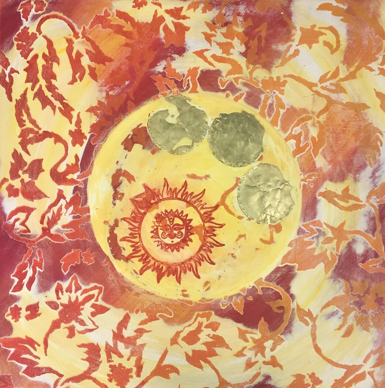 In a Hindu marriage, the wedding couple takes seven steps, called the Saptapadi, around a sacred fire while making seven vows. I took these steps and made these vows over 35 years ago when I married my husband, a native of South India. This was my first introduction to the Hindu culture of my new family. Over time, I have come to appreciate both the ancient traditions and modern progress of this complex, diverse culture. I interpret my understanding of the Saptapadi and my experience of Indian culture in this series of mixed media paintings.